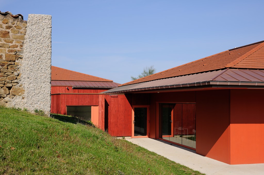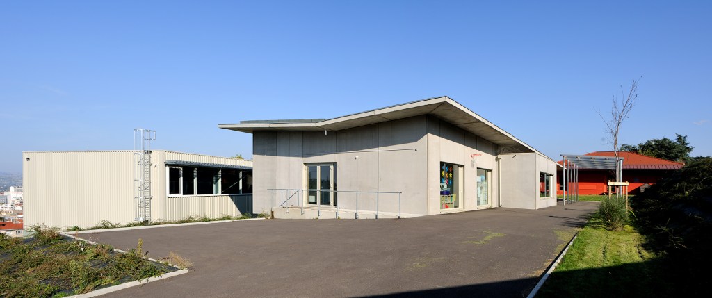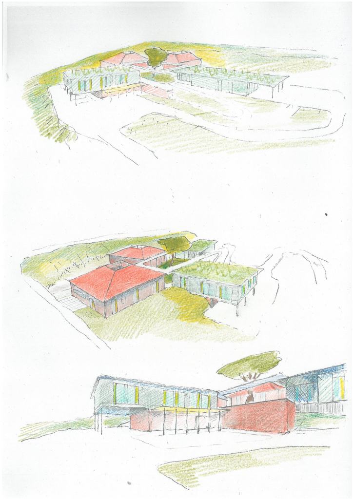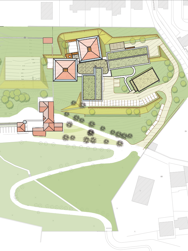 Le terrain sur lequel doit être implanté le projet présente une forte déclivité d’environ 16%. C’est un facteur déterminant, d’autant que les difficultés actuelles de fonctionnement et d’insécurité du site de Rocheclaine à la Valla en Gier viennent en partie de la forte déclivité du terrain. Multiples niveaux et escaliers compliquent la vie et les déplacements et constituent un vrai labyrinthe. Pour le projet à Saint-Etienne, tous les composants principaux sont installés au même niveau autour d’un patio jardin dont le rôle est à la fois fonctionnel, esthétique et symbolique. Bien que central, il n’est pas un passage obligé et d’autres chemins d’accès peuvent être créés notamment pour aller à « l’école ». Le modelage du terrain déblais/remblais compose avec la déclivité pour créer des protections et « clôtures naturelles » autour des bâtiments contribuant ainsi à l’inscription paysagère du projet.